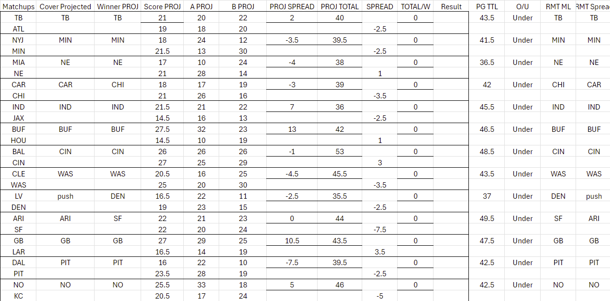 Spreads and totals are as of Wednesday AM, sorry if it has moved since we did the calculations. Miami New England and Giants Seahawks were not included in this model due to the Monday night impacts.