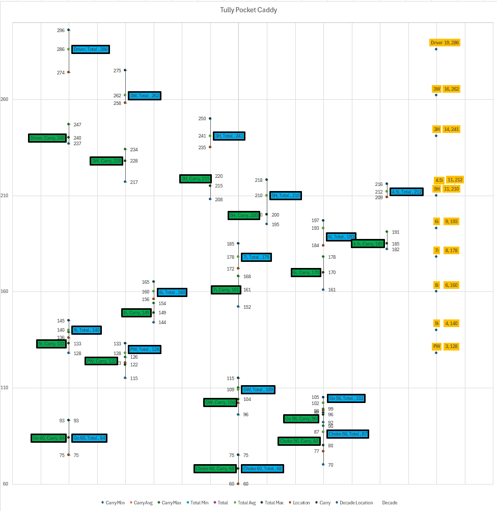 I took it a step further on my own, and built myself a pocket Caddy guide for my clubs. I entered the data in, Carry Min, Avg, Max, Total Min, Avg, Max. Happy to send along the Excel chart and rules if anyone is on a similar Sicko tier as myself. After a few tries, here’s how it came out.